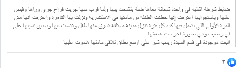 وقال أحد متداولي الصورة "ضابط شرطة اشتبه في واحدة شحاته معاها طفلة بتشحت بيها، ولما قرب منها جريت، فراح جري وراها وقبض عليها وباستجوابها اعترفت إنها خطفتها من مامتها في الإسكندرية ونزلت بها القاهرة، واعترفت إنها مش المرة الأولى اللي بتعمل فيها كده كل فترة تنزل مدينة مختلفة تسرق منها طفل وتشحت بيها وبعدين تسيبها على أي رصيف ودي صورة آخر بنت خطفتها، البنت موجودة في قسم السيدة زينب.. شير على أوسع نطاق تلاقي مامتها هتموت عليها".