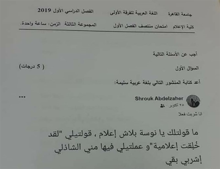 "ماقولتلك يانوسة بلاش إعلام" سؤال بجامعة القاهرة يثير الجدل