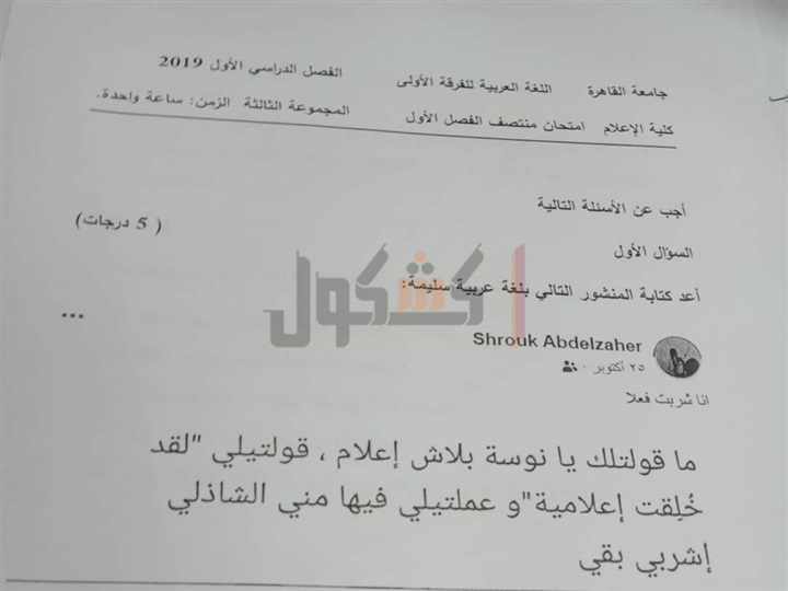 يذكر أنه تداول عدد من طلاب الفرقة الأولى بكلية الإعلام امتحان اللغة العربية شعبة ٣، يطالب بإعادة صياغة الجملة الآتية بلغة عربية صحيحة.