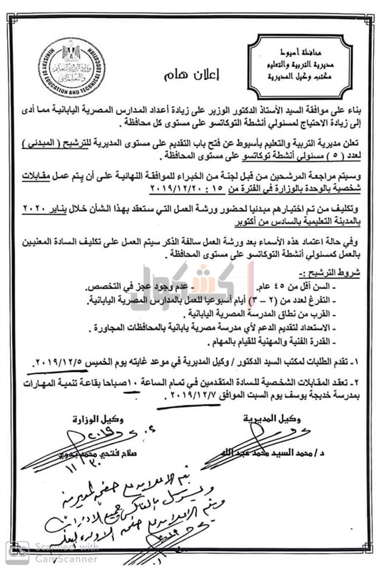 أعلنت مديرية التربية والتعليم والتعليم الفني بأسيوط، زيادة أعداد المدارس المصرية اليابانية، ما أدى لزيادة الاحتياج لمسئولي أنشطة التوكاتسو على مستوى المحافظة.