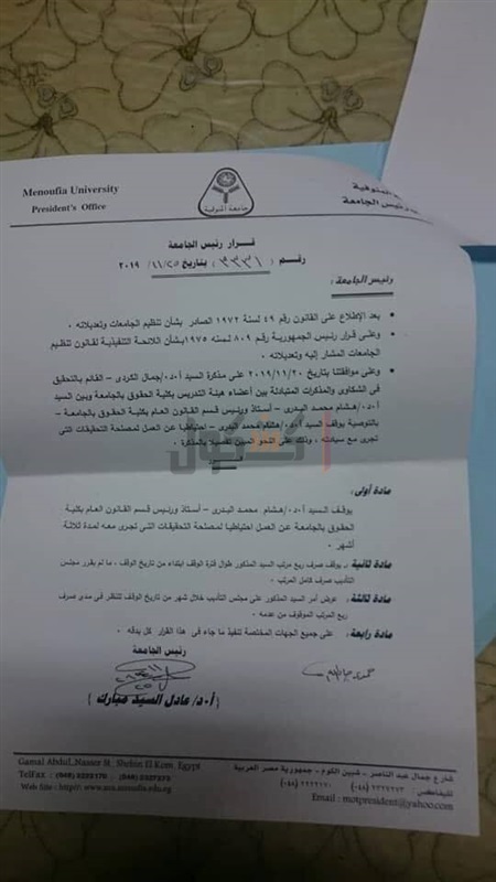 رئيس الجامعة، وقف صرف ربع مرتب "البدري" طوال فترة الوقف ابتداءً من