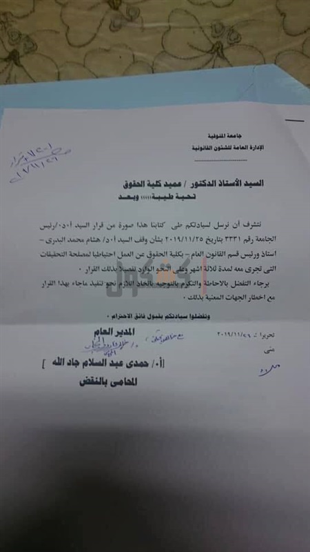 بسبب المذكرات المتبادلة.. إيقاف رئيس قسم القانون بـ"حقوق المنوفية" عن العمل