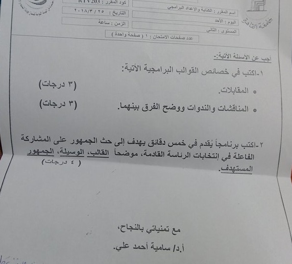 طلب امتحان مادة "الكتابة والإعداد البرامجى" بالفرقة الثانية كلية الإعلام جامعة القاهرة، للدكتورة سامية أحمد على الأستاذ بقسم الإذاعة والتليفزيون بالكلية، من الطلاب بالامتحان من تقديم برنامجا يهدف حث الجمهور للمشاركة بالانتخابات الرئاسية، وذلك بامتحانات الميدترم بالكلية، أمس الأحد.
