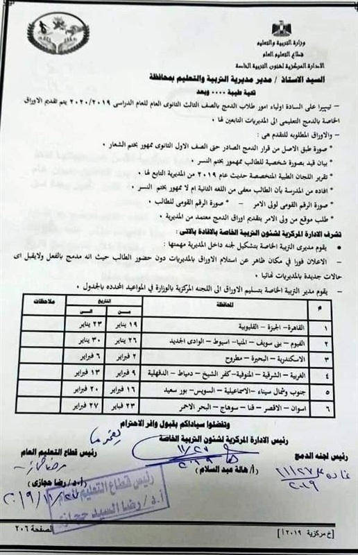 عممت وزارة التربية والتعليم والتعليم الفني فاكس علي المديريات التعليمية اكدت خلاله انه تيسيرا علي أولياء امور طلاب الصف الثالث الثانوي دمج للعام الدراسي 2019/2020 يتم تقديم الاوراق الخاصة بالدمج التعليمي الي المديريات التابعين لها.