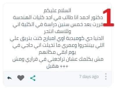 وجاء نص الرسالة كالتالي "السلام عليكم دكتور أحمد أنا طالب في أحدي كليات الهندسة قررت بعد خمس سنوات في الكلية اني وللاسف انتحر، الدنيا دي كوميدية اووي امبارح كنت بتريق علي اللي بينتحروا، وعمري ما تخيلتي اني في يوم هبقي مكانهم، مش بكلمك علي ترجعني عن قراري ومش هقبل خالص انك تكلمني".