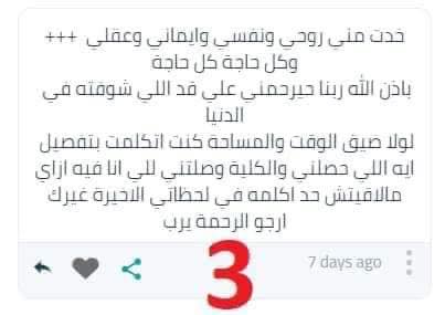 واستكمل الرسالة "الكلية دي أخدت مني كل حاجة بالمعني الحرفي، خدت مني روحي ونفسي وإيماني وعقلي وكل حاجة، باْذن الله ربنا هيرحمني علي قد اللي شوفته في الدنيا، لولا ضيق الوقت والمساحة كنت اتكلمت بالتفصيل عن ايه اللي حصلي والكلية وصلتني للي انا فيه ازاي، ملقتش حد اكلمه في لحظاتي الأخيرة غيرك".