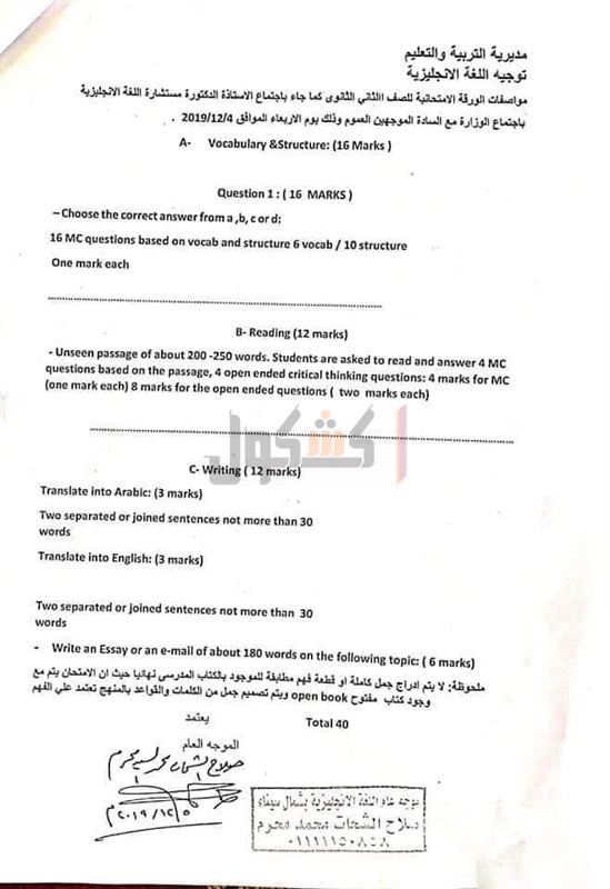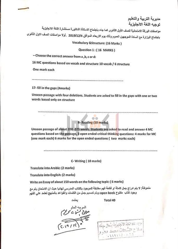 وفيما يخص الورقة الامتحانية للصف الثاني الثانوي حدد مستشار مادة اللغة الإنجليزية عدد 3 أسئلة، السؤال الأول، اختر الإجابة الصحيحة وهو مكون من 16 نقطة لكل نقطة درجة.