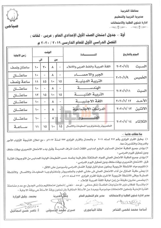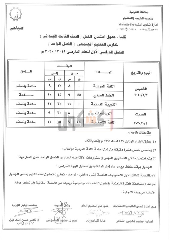 مديرية التربية والتعليم بالغربية جداول امتحانات صفوف النقل والشهادة الإعدادية، والتعليم المهني، والتي تجرى ضمن اختبارات منتصف العام الدراسي 2019/2020.