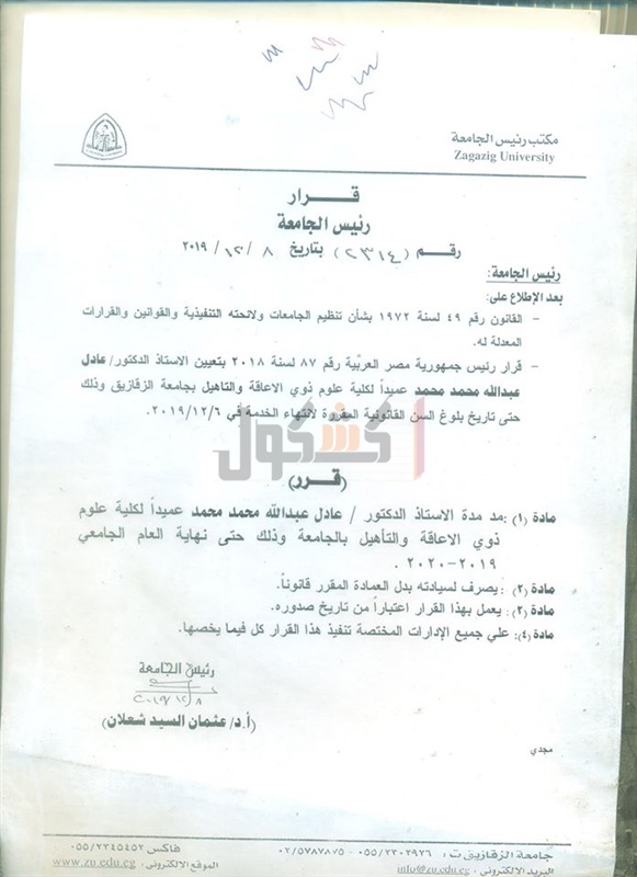 أصدر الدكتور عثمان شعلان رئيس جامعة الزقازيق، القرار رقم 2314 بمد فترة عمادة الدكتور عادل عبدالله محمد لكلية علوم ذوي الإعاقة والتأهيل حتي نهاية العام الجامعي 2019/2020.