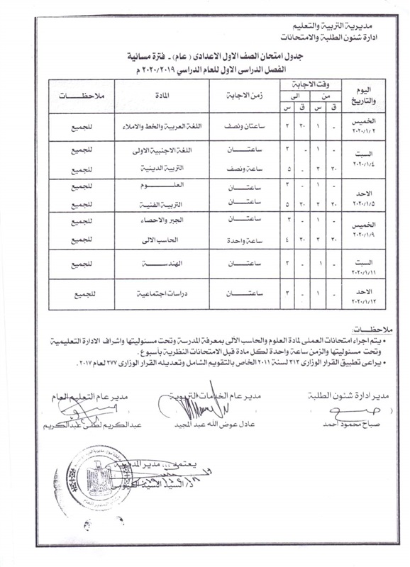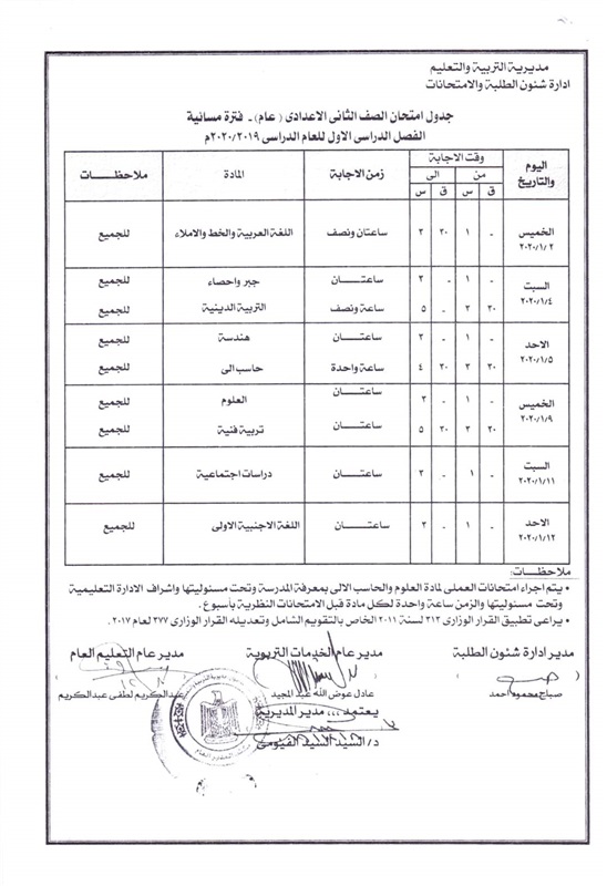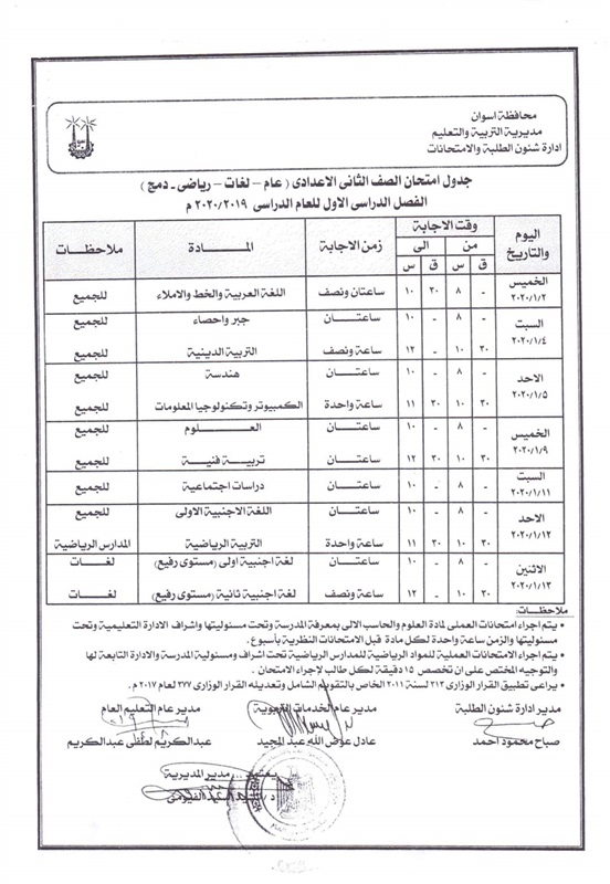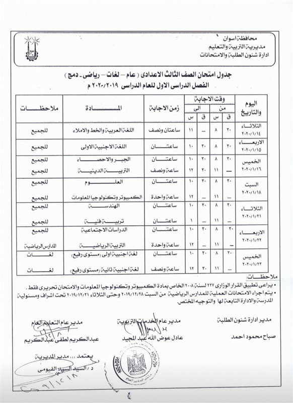 مدارس ننشر جدول امتحانات الفصل الدراسي الأول لطلاب أسوان محمود الشريف الجمعة 13/ديسمبر/2019 - 04:34 م 12/13/2019 4:34:00 PM طباعة أعلنت مديرية التربية والتعليم بأسوان جدول امتحانات الفصل الدراسي الاول للعام الدراسي 2020/2019 لجميع الفصول.وإليكم الجدول: facebook twitter whats شارك