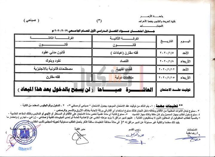 وذلك وفقًا للجدول المعلن من قبل ادارة جامعة الأزهر والتى ستكون على جميع طلاب