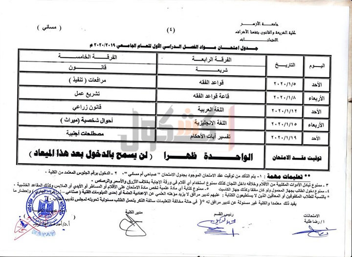 أعلنت كلية الشريعة والقانون بجامعة الأزهر فرع الدقهلية للبنين، عن جدول امتحانات الدور الأول لطلاب الفرقتين الرابعة والخامسة شعبة القانون بالكلية خلال العام الدراسي الحالي 2019-2020.
