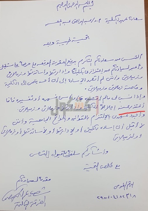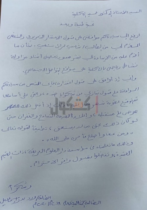 رابعا : بعد مبادرة كريمة من الجامعة أدت إلى تقدم الطالب/ شعيب باعتذار شفهي وكتابي للطالبة ولإدارة الكلية عما بدر منه من تصرفات غير مقصود منها الإساءة إلى الطالبة أو للكلية، وقد قبلت الطالبة اعتذار الطالب، وبناء عليه قامت بالتنازل عن الشكوى الأمر الذي أدى إلى انتهاء الأزمة بقبول اعتذار الطالب وكذلك قبول الالتماس الذي تقدم به للاكتفاء بالمدة التي انقضت من العقوبة مراعاة لمستقبل الطالب وتمكينه من دخول امتحانات الفصل الدراسي الأول.