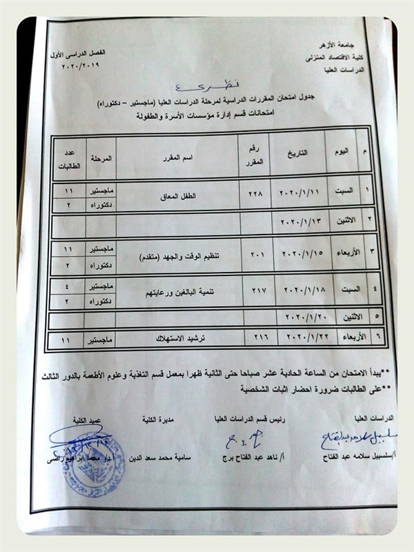 أعلنت كلية الاقتصاد المنزلى بجامعة الأزهر فرع البنات طنطا، عن جدول امتحانات الدور الأول لجميع الفرق بالكلية خلال العام الدراسى الحالى 2019-2020.