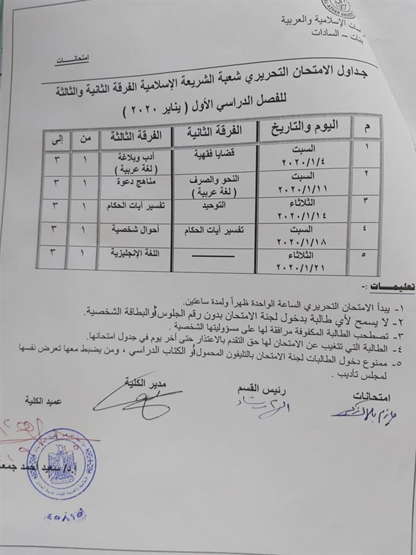 أعلنت كلية الدراسات الاسلامية والعربية بجامعة الأزهر فرع المنوفية، عن جدول امتحانات الدور الأول لجميع الفرق بالكلية خلال العام الدراسى الحالى 2019-2020.