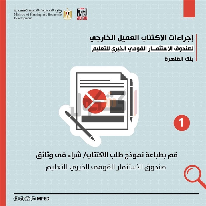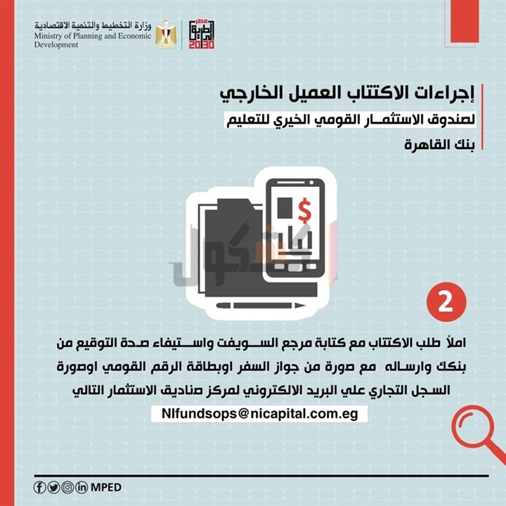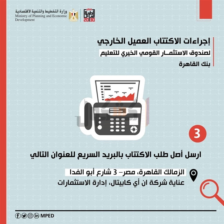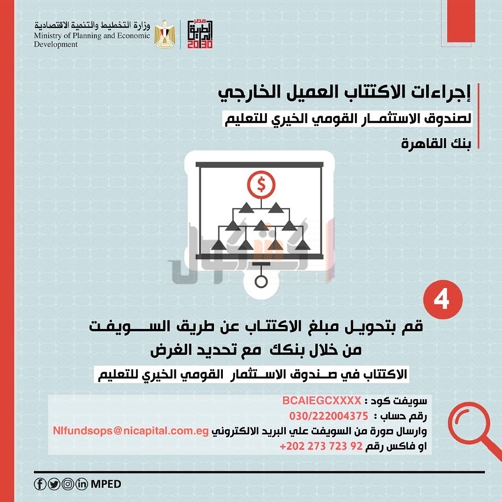 أعلنت وزارة التخطيط والتنمية الاقتصادية إرشادات الاكتتاب فى صندوق الاستثمار القومى الخيري للتعليم من خلال بنك القاهرة، وهي خاصة بالتحويلات من خارج مصر للصندوق؛ والتي يجب أن تتم عن طريق بنك القاهرة.