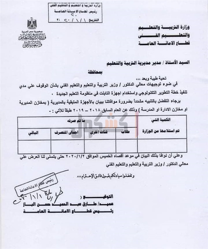 وجهت وزارة التربية والتعليم والتعليم الفني, المديريات التعليمية بضرورة موافاتها ببيان بالأجهزة المتبقية بمخازن المديرية ومخازن الاداراة وذلك العام الدراسي السابق 2018/2019.