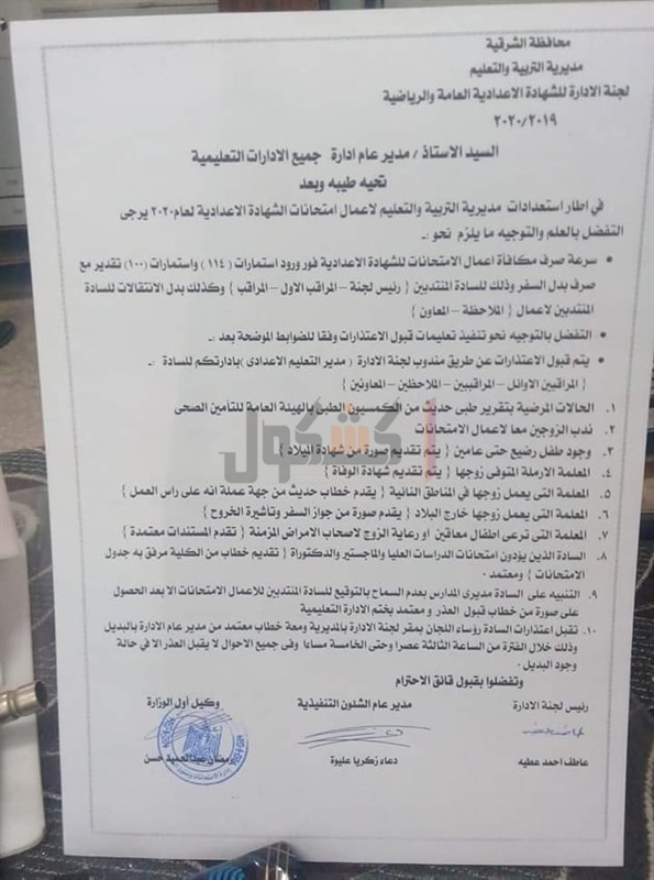 ضوابط اعتذارات أعمال امتحانات الشهادة الإعدادية بالشرقية (مستند)
