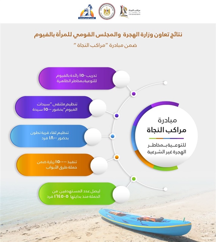 كشفت وزارة الدولة للهجرة وشئون المصريين بالخارج، عن الجهود المبذولة في مبادرة "مراكب النجاة" في أولى محطاتها بمحافظة الفيوم، وذلك تنفيذاً لتكليف الرئيس عبد الفتاح السيسي رئيس الجمهورية في ختام النسخة الثالثة من منتدى شباب العالم.