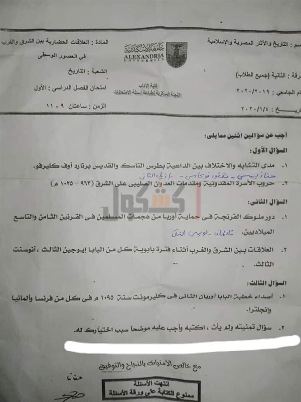 تداول رواد مواقع التواصل الاجتماعي صورة من امتحان مادة التاريخ والأثار المصرية والإسلامية، لكلية الأداب قسم التاريخ، جامعة الإسكندرية، وجاء فيه "سؤال تمنيته ولم يأتي أكتبه وأجب عليه موضحاً سبب اختيارك له".