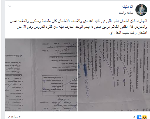 وأوضحت ولي الأمر قائلة:" النهارده كان امتحان بنتي اللي في تانيه إعدادي وللأسف الامتحان كان ملخبط ومتكرر والقطعة ناقصة".