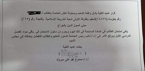 قررت كلية الشريعة والقانون بجامعة الأزهر بالقاهرة، إلغاء امتحانات الفصل الدراسي الأول للطالب "أ.م.ط" بالفرقة الأولى شعبة الشريعة، لمحاولته الغش وإثارة الشغب باللجنة.
