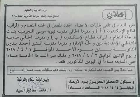 أعلنت مديرية التربية والتعليم، والتعليم الفني بالإسكندرية، البدء في تلقي طلبات الأعضاء الجدد للعمل في لجان النظام والمراقبة قطاع الإسكندرية "أ" ومقرها الحالى مدرسة نبوية موسي التجريبية بنات، ولجنة النظام والمراقبة الإسكندرية قطاع "ب" ومقرها مدرسة الشاطبي الإعدادية بنين ولجنة الإدارة ومقرها مدرسة المشير أحمد بدوى الثانوية بنين غدًا الأحد.