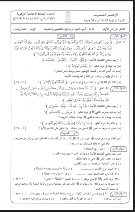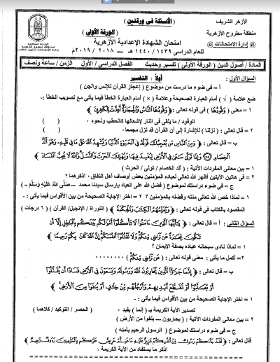 امتحانات سابقة للورقة الأولى "تفسير وحديث" للشهادة الإعدادية الأزهرية