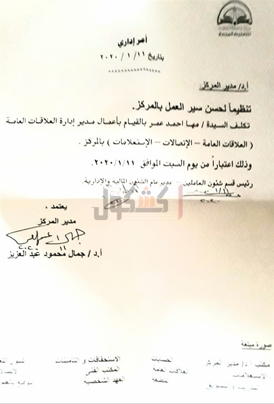 أصدر الدكتور جمال محمود عبدالعزيز مدير مزكر التعليم المدمج بجامعة القاهرة، قرار بتكليف مها أحمد عمر بالقيام بأعمال مدير إدارة العلاقات العامة "العلاقات العامة - الاتصالات - الاستعلامات" بالمركز.