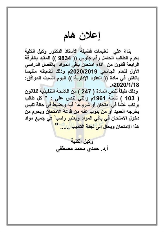 أعلنت كلية الشريعة والقانون بجامعة الأزهر فرع الدقهلية، عن حرمان طالب بالفرقة الرابعة قسم القانون يحمل رقم جلوس "9834" من أداء باقي امتحانات الفصل الدراسي الأول من العام الجامعي الحالي 2019-2020، وذلك بعد ضبط الطالب متلبسًا بالغش فى امتحانات اليوم من العام الحالي.