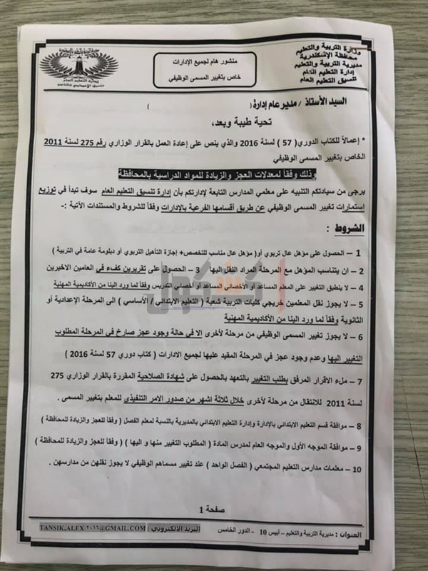 بالأسكندرية بالتنبيه علي معلمي المدارس بأن إدارة تنسيق التعليم العام سوف تبدأ
