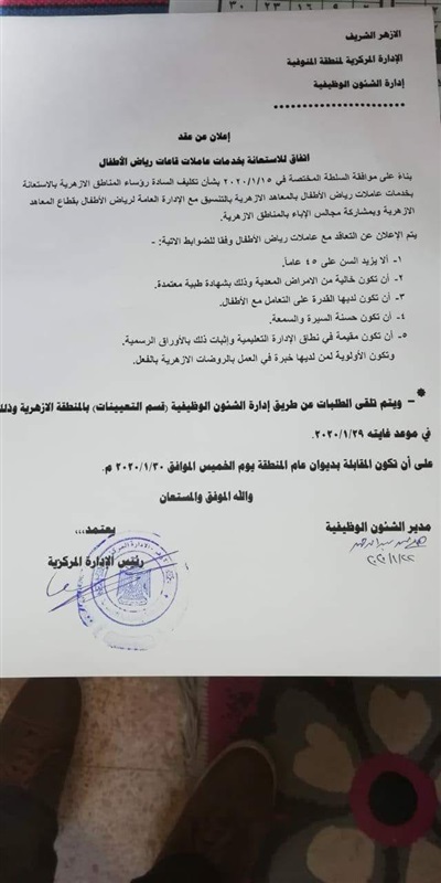 أعلنت منطقة المنوفية الأزهرية، حاجتها لعاملات قاعات رياض الأطفال بالإدارات التعليمية، وبمشاركة مجلس الآباء بالمنطقة.