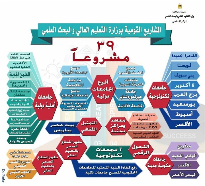 نشرت الصفحة الرسمية لوزارة التعليم العالي والبحث العلمي، عبر موقع التواصل الاجتماعي فيسبوك، صورة توضح أبرز المشروعات القومية التي نفذتها الوزارة خلال الفترة القادمة والتي بلغت 39 مشروع.