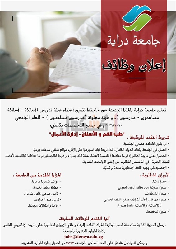 تعلن جامعة دراية بالمنيا الجديدة عن حاجتها لتعين أعضاء هيئة تدريس (أساتذة - أساتذة مساعدون - مدرسون )، وهيئة معاونة (مدرسون مساعدون) - للعام الجامعي 2020/2021م، في جميع التخصصات بكليتي، "طب الفم و الأسنان - إدارة الأعمال".