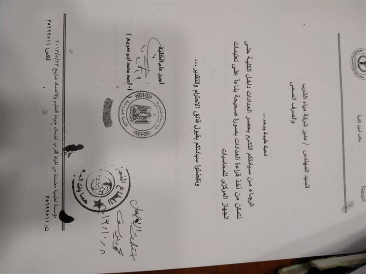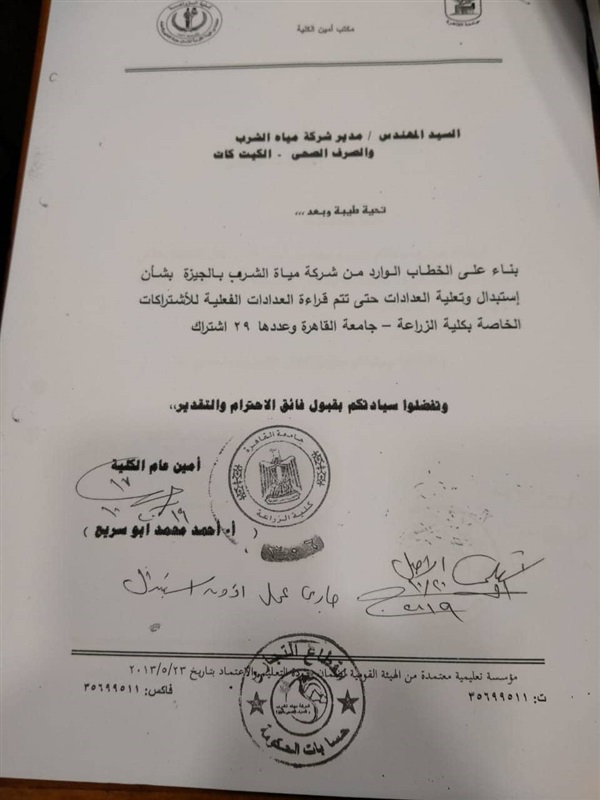 وشدد على أن أمين الكلية خاطب شركة المياه بصورة رسمية منذ ثلاثة أشهر بخطاب رسمي حصل "كشكول" على صورة منه، لتنفيذ توصيات الجهاز، وحصر عدادات المياه داخل الكلية حتى تتمكن إدارة الكلية من أخذ قرائها بصورة صحيحة، بناء على تعليمات الجهاز المركزي للمحاسبات.