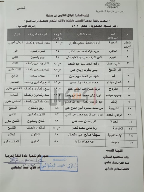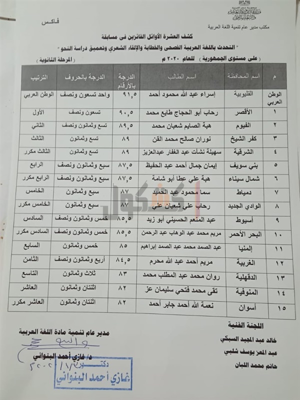 أعلنت وزارة التربية والتعليم والتعليم الفني ، نتيجة مسابقة التحدث بالفصحى والخطابة والإلقاء الشعري لعام 2020 على مستوى الجمهورية للمرحلتين الاعدادية والثانوية.