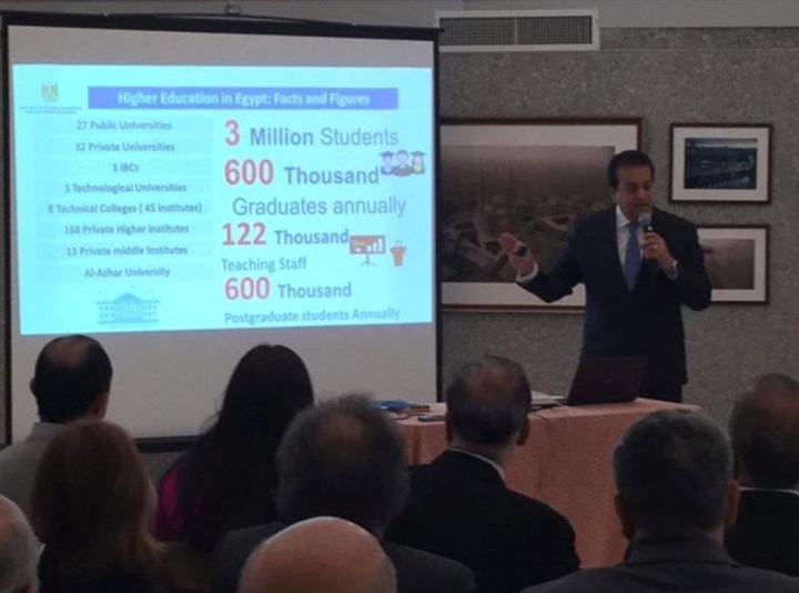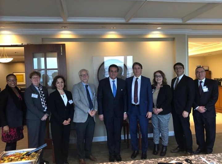 ومن جهة أخرى التقى الوزير بمقر السفارة المصرية بواشنطن، بما يزيد عن ثلاثين أستاذًا وباحثًا أمريكيًّا من أصل مصري بجامعات جورج واشنطن وجورج مايسون وميرلاند وجونز هوبكينز، وعدد من ممثلي البنك الدولي، وصندوق النقد الدولي، والمعاهد الوطنية للصحة، وهيئة الغذاء والدواء الأمريكية، والمبتعثين المصريين. وقدم الوزير عرضًا عن المنظومة التعليمية والبحثية المصرية، وما تشهده من تطوير وتحديث باستثمارات ضخمة، وأبرز الرؤى والتطلعات المستقبلية التي تسعى إلى تحقيقيها.