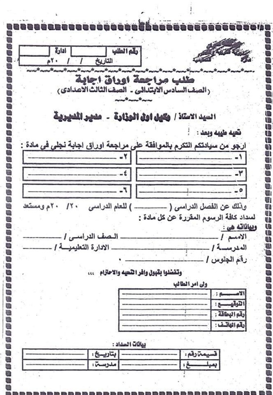 وأوضحت المديرية في بيانها، على ولى الأمر التقدم بطلب لمدير المديرية طبقًا للنموذج المطبوع، وسيتم تلقى الطلبات بديوان المديرية وتم تحديد مبلغ وقدره (عشرون جنيهًا) فقط لا غير للمادة الواحدة (تورد بخزينة المديرية)، على أن تكون التظلمات لأى عدد من المواد.