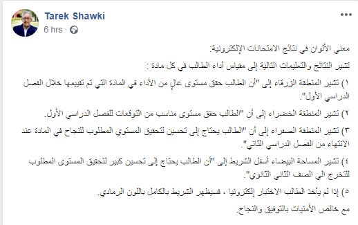 أوضح الدكتور طارق شوقي وزير التربية والتعليم والتعليم الفني، معنى الألوان في نتائج الامتحانات الإلكترونية.