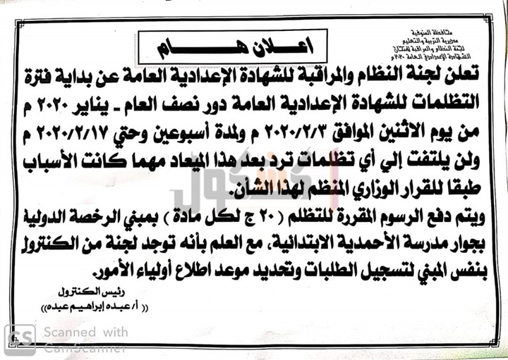 أعلنت لجنة النظام والمراقبة للشهادة الإعدادية العامة بالمنوفية، عن بداية فترة التظلمات للشهادة الإعدادية العامة نصف العام دور يناير 2020.