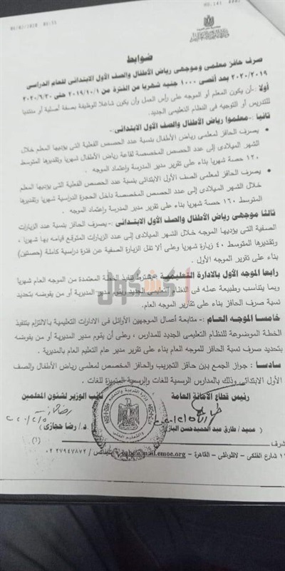 أعلنت وزارة التربية والتعليم والتعليم الفني، ضوابط صرف حافز معلمي وموجهي رياض الأطفال والصف الأول الإبتدائي للعام الدراسي 2019/2020 بحد أقصى 1000 جنيه شهريا من الفترة 1أكتوبر 2019 وحتى 30 يونيو 2020.
