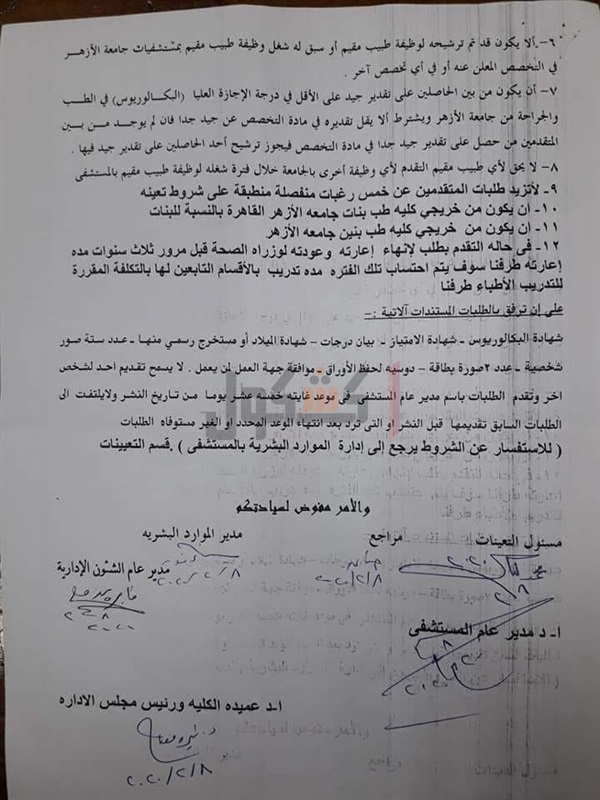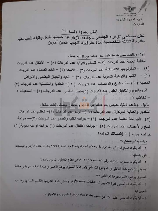 أعلنت مستشفى الزهراء الجامعي التابع لكلية طب بنات الأزهر بالقاهرة، حاجتها لشغل وظيفة طبيبة مقيمة من خريجي كلية طب البنات.
