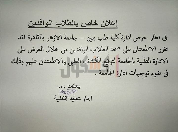 قال الدكتور خيري عبدالحميد وكيل كلية طب بنين بجامعة الأزهر بالقاهرة، إن الجامعة قررت توقيع الكشف الطبي على الطلاب الوافدين بالإدارة الطبية.