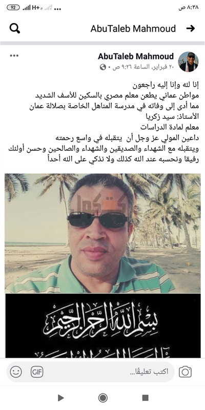 وأكد أحد أبناء الجالية المصرية في عمان أن المعلم المصري تم طعنه من قبل ولي أمر عماني باستخدام سكين، موضحًا أنه كان يُدرس مادة الدراسات بمدرسة المناهل الخاصة بصلالة.