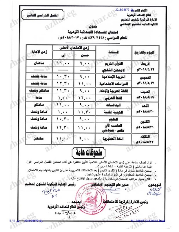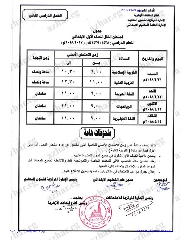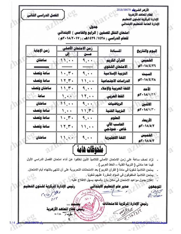 ننشر جداول امتحانات نهاية العام للنقل والشهادة الابتدائية بالأزهر