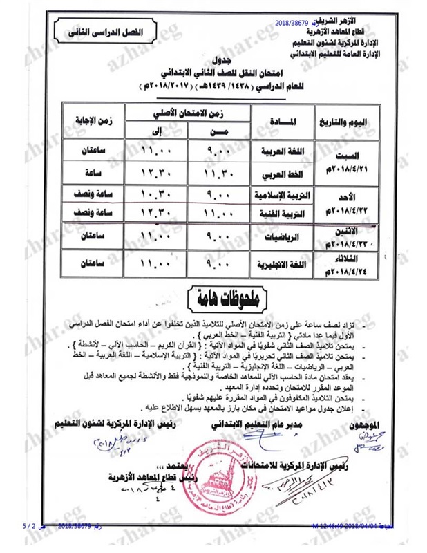 أعلن قطاع المعاهد الأزهرية، جداول امتحانات الفصل الدراسي الثاني، للنقل والشهادة الابتدائية، للعام الدراسي 2017/2018.