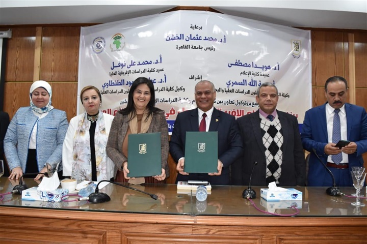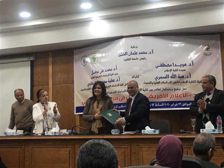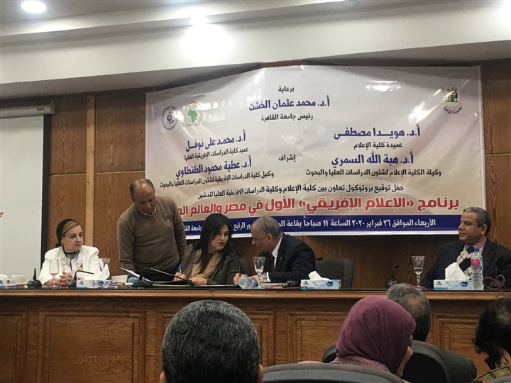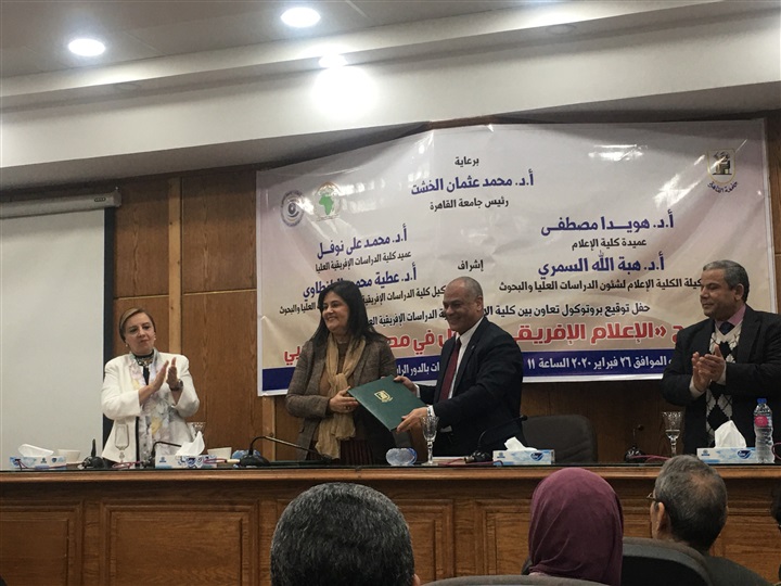 وأعقب ذلك توقيع الدكتورة هويدا مصطفى عميدة كلية الإعلام جامعة القاهرة بروتوكول التعاون لتدشين برنامج الإعلام الإفريقي، مع الدكتور محمد علي نوفل، عميد كلية الدراسات الإفريقية العليا.