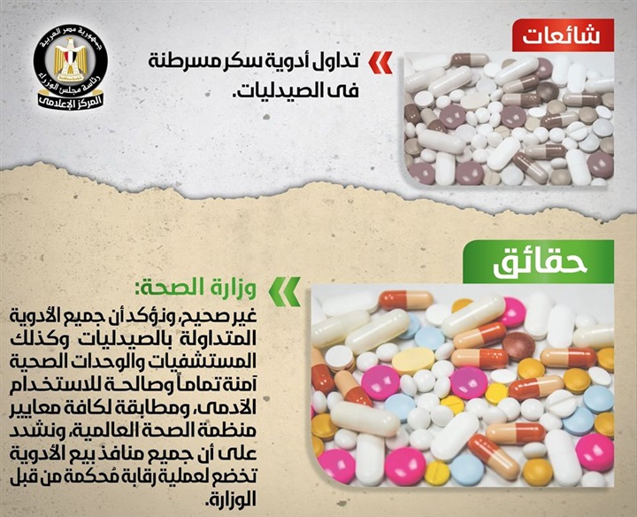 نفى المركز الإعلامي التابع لمجلس الوزراء، ما انتشر في بعض وسائل الإعلام والمواقع الإلكترونية وصفحات التواصل الاجتماعي، من أنباء حول تداول أدوية سكر مسرطنة في الصيدليات.