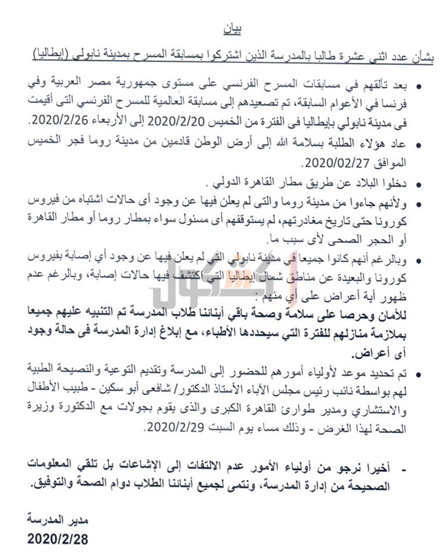 أصدرت مدرسة بالضاهر في القاهرة، بيانًا أمس، بشأن عدد أثنى عشر طالب بالمدرسة الذين اشتركوا بمسابقة المسرح بمدنية نابولي الايطالية.