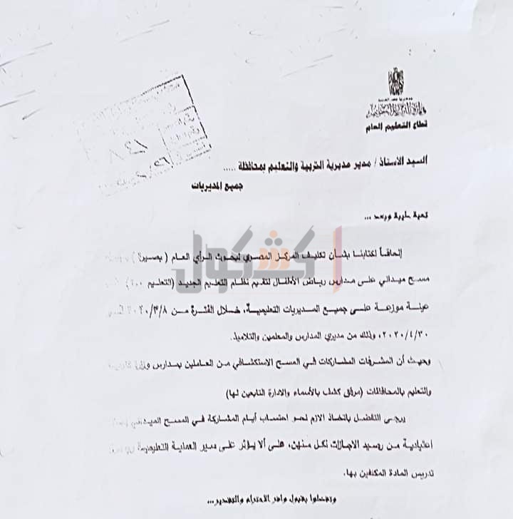 ألحقت وزارة التربية والتعليم والتعليم الفني كتاب دورى حول تكليف المركز المصرى لبحوث الرأي العام بعمل مسح ميداني علي مدارس رياض الأطفال لتقييم نظام التعليم الجديد .